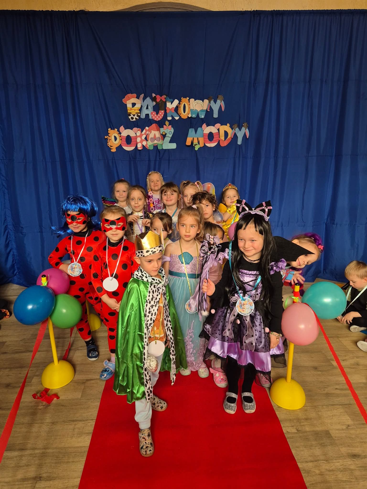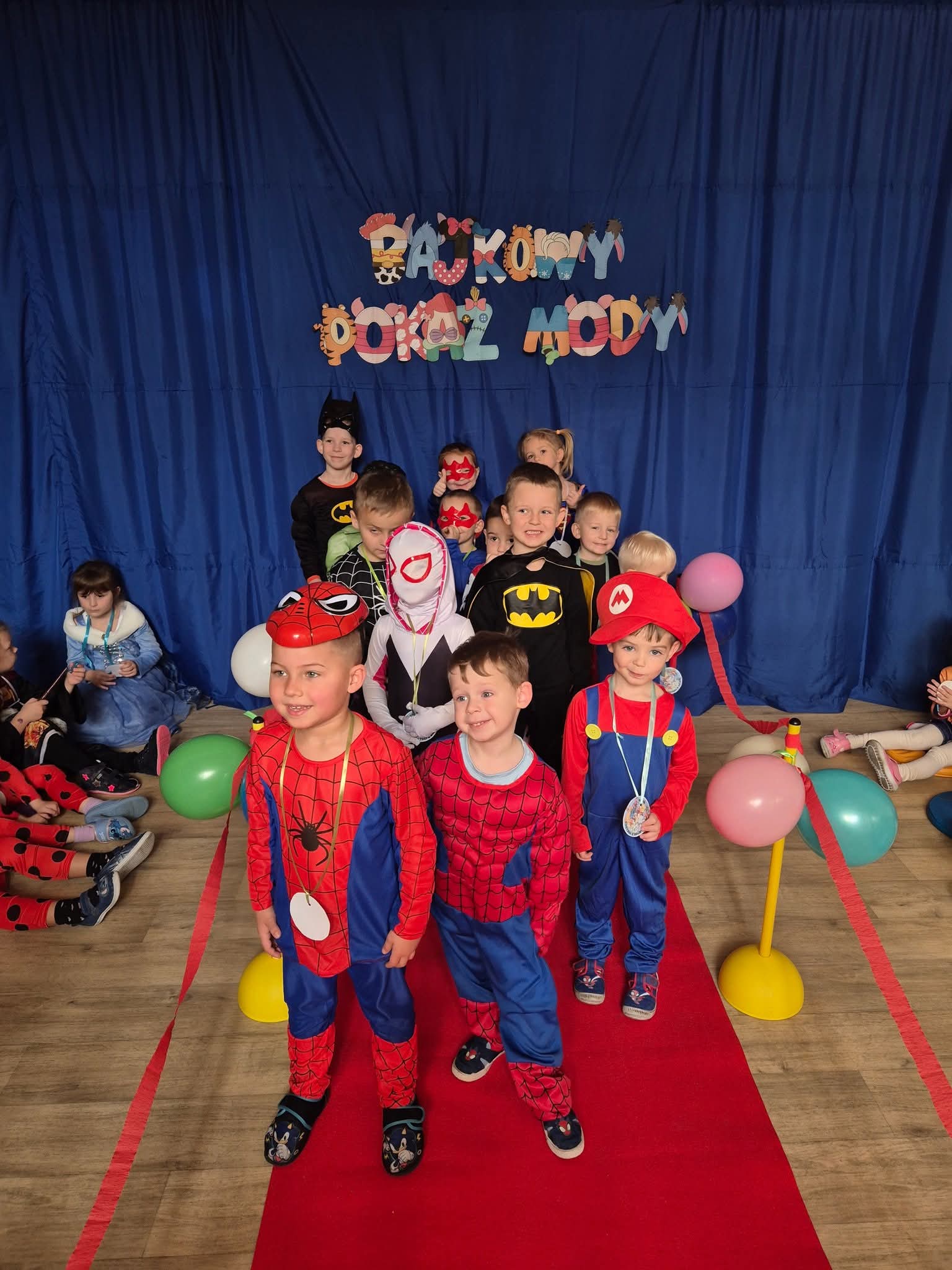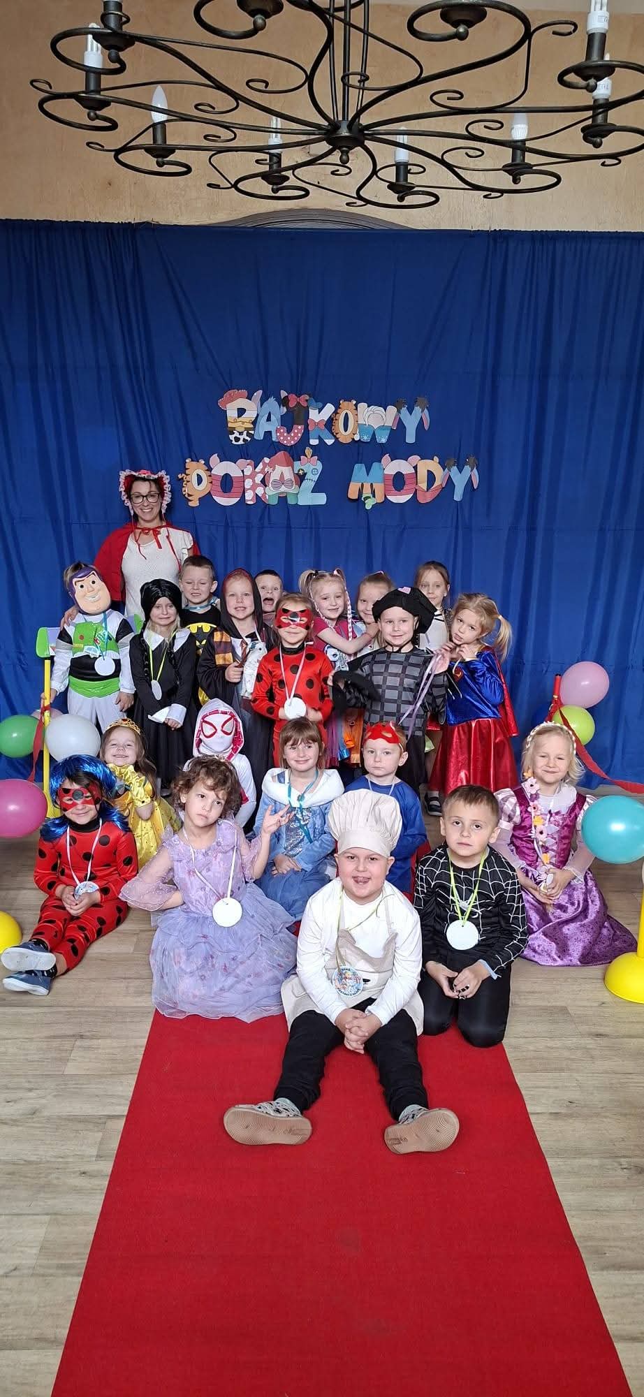 Po czerwonym dywanie dumnie kroczyli mali modele i modelki z grupy IV, V, VI i VII przebrani za swoich ulubionych bohaterów z bajek. Nie zabrakło księżniczek, odważnych superbohaterów, czarodziejów, wróżek, piratów, zwierzątek oraz postaci z klasycznych i współczesnych opowieści 👩🍳🦸♀️🦸♂️💃.
