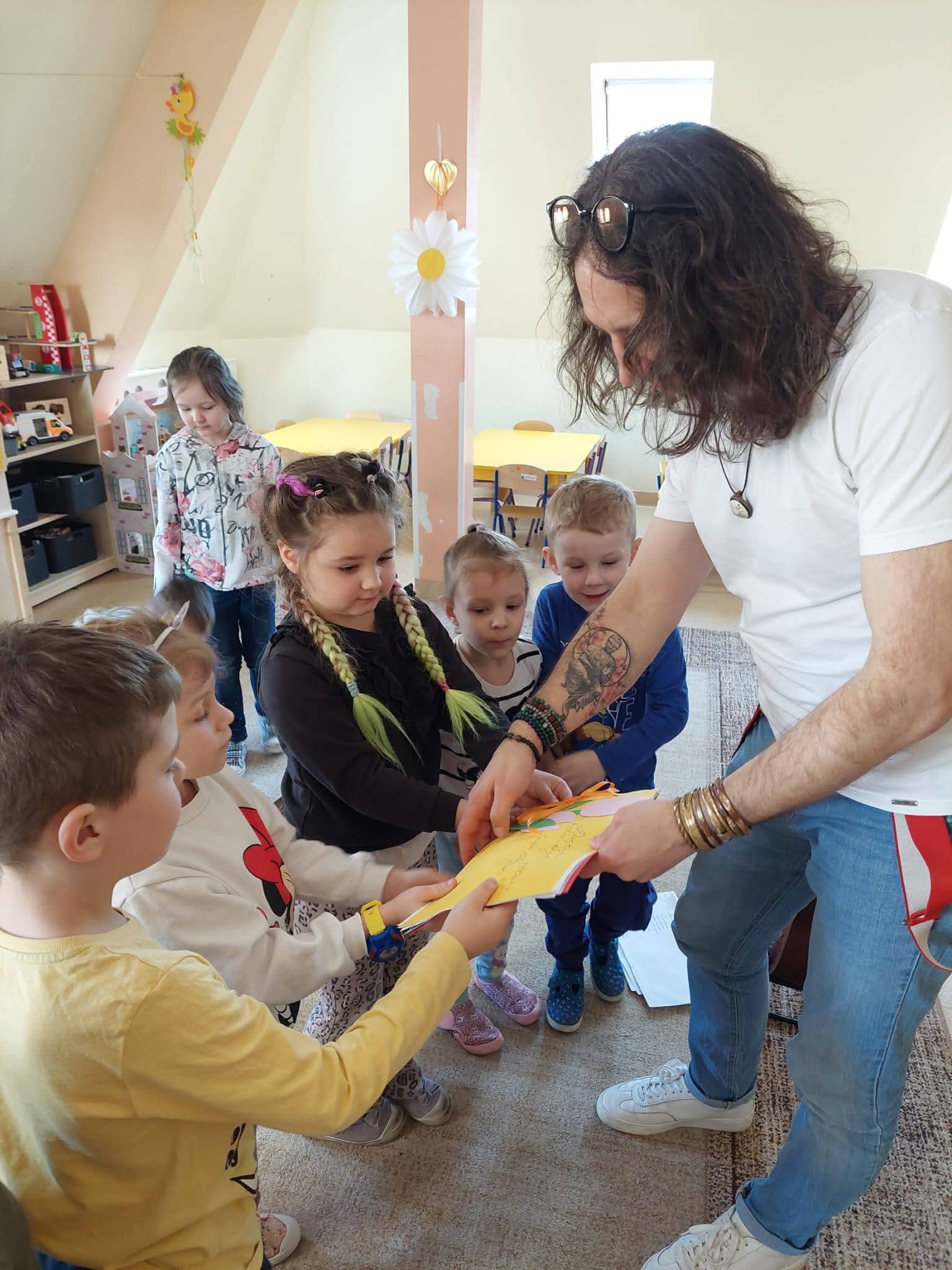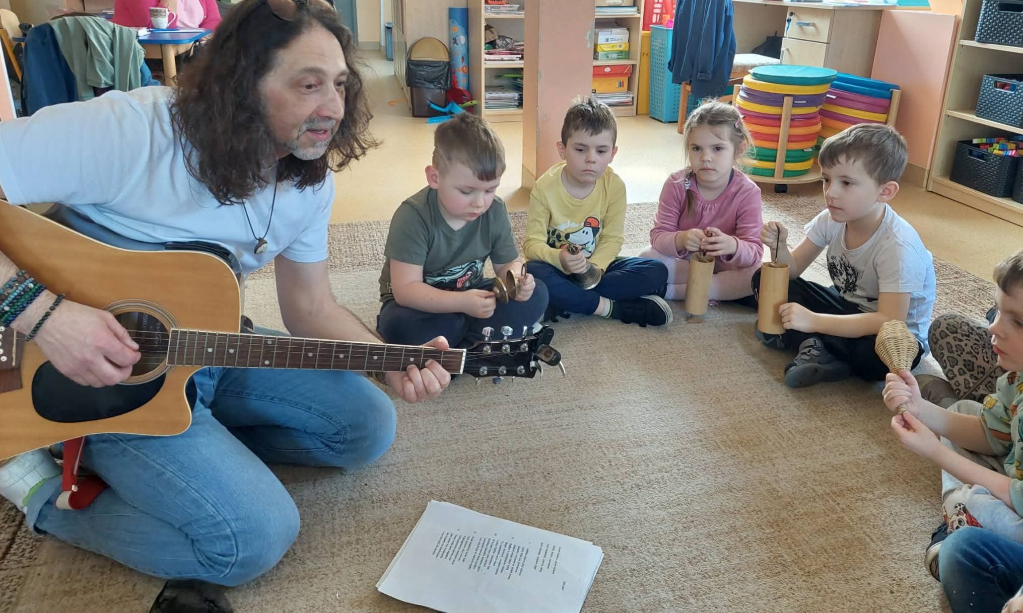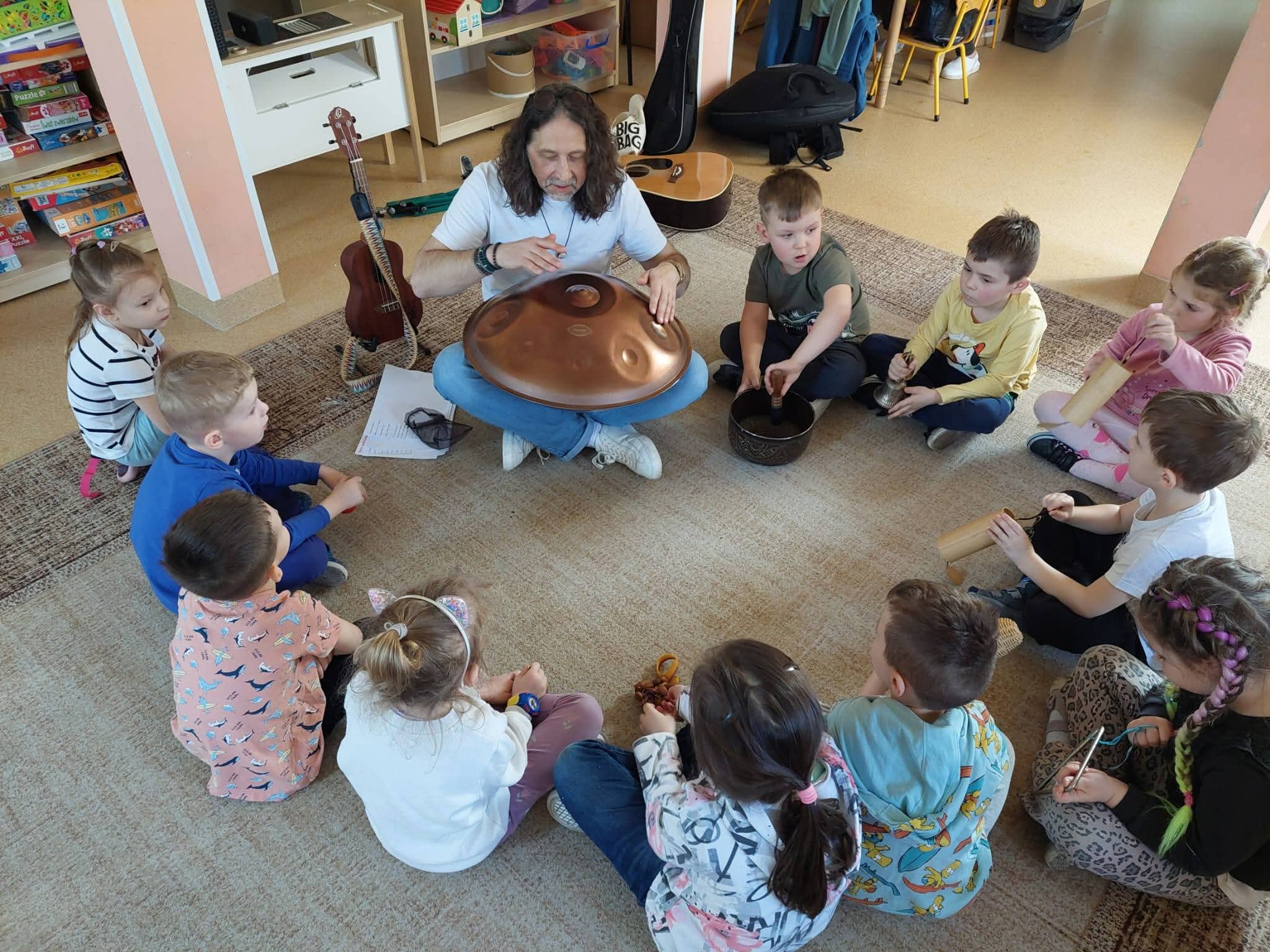 Odwiedził nas niezwykły muzyk – Pan Mirek, który zabrał dzieci w piękną, wiosenną podróż muzyczną. 🌸 Dzięki niemu mali odkrywcy mogli poznać zarówno znane, jak i mniej znane instrumenty muzyczne oraz usłyszeć ich wyjątkowe brzmienia, a także zagrać i zaśpiewać wiosenne piosenki.