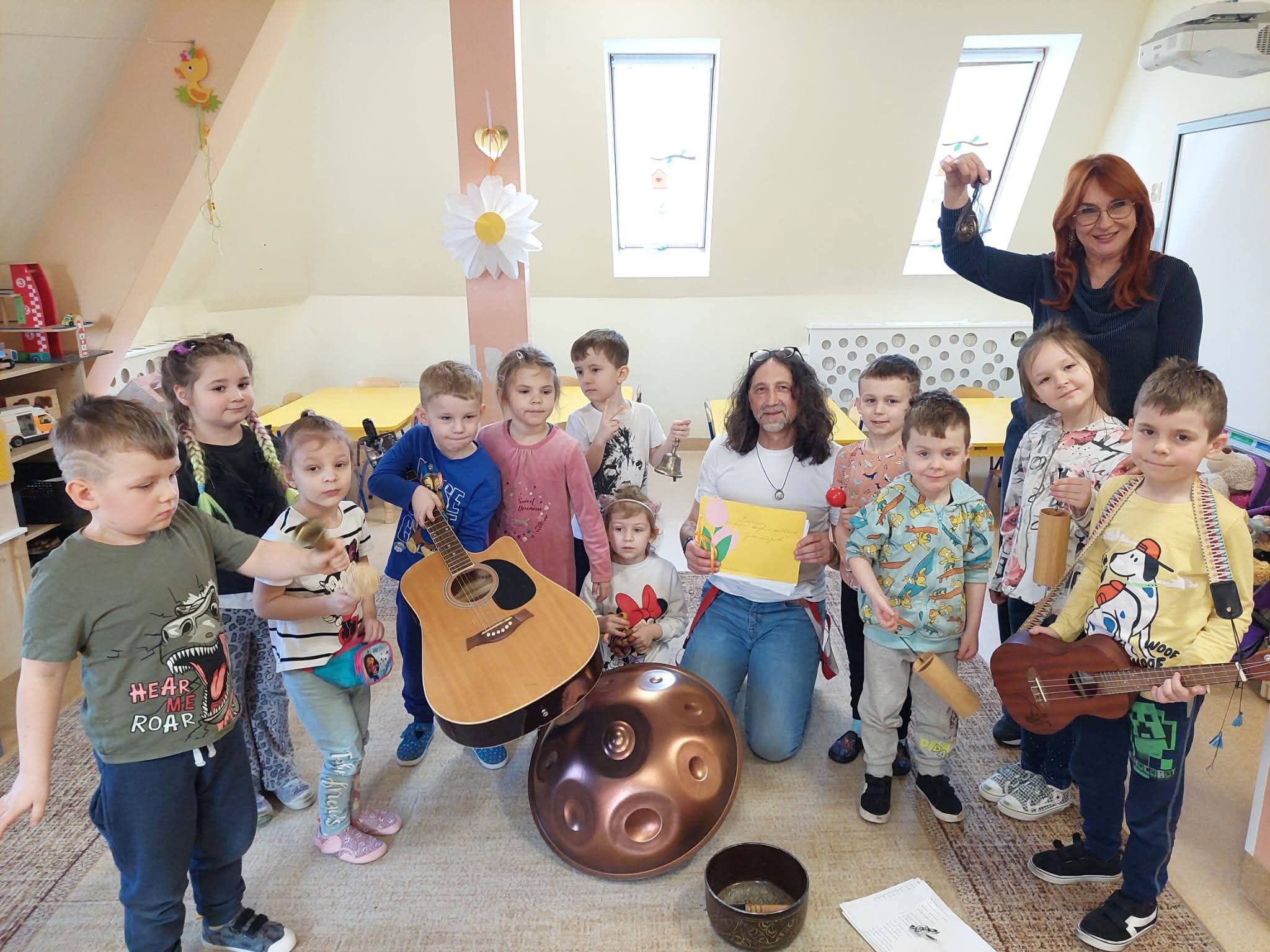 Odwiedził nas niezwykły muzyk – Pan Mirek, który zabrał dzieci w piękną, wiosenną podróż muzyczną. 🌸 Dzięki niemu mali odkrywcy mogli poznać zarówno znane, jak i mniej znane instrumenty muzyczne oraz usłyszeć ich wyjątkowe brzmienia, a także zagrać i zaśpiewać wiosenne piosenki.